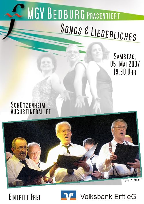 Am Samstag, den 5.5.2007, 19.30 Uhr (Einlass 19.00 Uhr), veranstaltet der MGV Bedburg im Schützenheim (ehemals "Notkirche"), Augustinerallee, seinen diesjährigen Liederabend unter dem Motto "Songs & Liederliches".